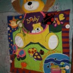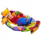 Яркий красочный коврик предназначен для деток с самого рождения. Материал коврика – плотный ситец, который способен перенести многочисленные стирки. Есть вставки тканей разных фактур: гладкие и шершавые. Нижняя часть коврика однотонная светло-бежевая из плотной непромокаемой ткани. Коврик легко собирается в сумку и его можно взять с собой на прогулку или в поездку. Он также удобно трансформируется в кроватку — лодочку, с подушкой-мишкой. Это помогает на начальной стадии координации и движений малыша. Для более старших детей он может использоваться как напольный коврик с разнообразными развивающими задачами. Мягкий коврик выполнен из разноцветной ткани в виде лесной полянки в центре которой сидит большой добрый мишка Бобби со своим маленьким медвежонком. На коврике крепится большая яркая шуршащая звезда из различных тканевых вставок для развития тактильных ощущений ребенка, большая божья коровка – мягкая погремушка, у которой брюшко-зеркальце диаметром 13 см.