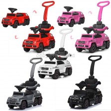 высота (с родительской ручкой) – 85см, длина – 86см (длина машины 64см), ширина – 42см (ширина по колесам 28см).