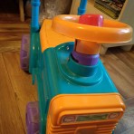 Толокар в хорошем состоянии. Не раздолбан, катались только дома. Есть небольшой скол пластика впереди, на последней фотке видно. Зато колеса в прекрасном состоянии. Багажник открывается. Фирма Орион.