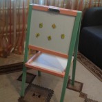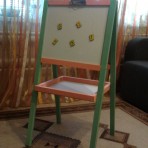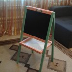 Мольберт из окрашенной ольхи с двумя рабочими поверхностями 35см*40см: меловой и маркерно-магнитной, общая высота мольберта 85см. Зажим для бумаги позволяет прикреплять любой формат бумаги.