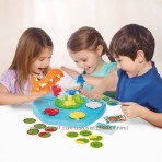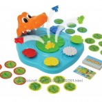 Правила игры: и гровое поле-озеро ставят в середину стола. Затем каждый игрок выбирает себе лягушку определенного цвета и получает по 5 фишек такого же цвета. Лягушат ставят на большую кувшинку игрового поля. Выбирают ведущего игрока, который перемешивает карточки-действия и кладет картинками вниз рядом с полем. Ведущий берет карточки и переворачивает их до того момента, пока не выпадет карта голодного крокодила Кроко. Остальные игроки, увидев эту карту, должны быстро нажать кувшинку-рычаг своего цвета так, чтобы их лягушек не съел крокодил. Если крокодил проглотил лягушку игрока, у него забирают одну фишку. Когда у игрока не остается фишек, он выбывает из игры. Игра продолжается до тех пор, пока у игроков на руках не останется ни одной фишки. Победит самый удачливый!