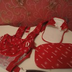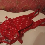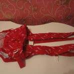 Красного цвета из х\б ткани с синтепоновой подложкой. Имеются две сменные спинки, хорошо фиксирующие головку малыша, при этом ножки и ручки свободны.