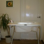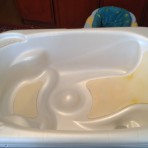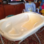 Действительно удобная вещь. Благодаря вставкам и наклонной части ванночки можно самой покупать малыша в случае необходимости - он не соскользнёт в воду. Есть нюанс - см. на фото.(желтенькие пятнышки, от добавления травы для купания)