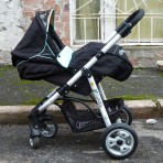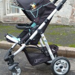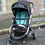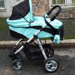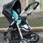 Коляска стильно смотрится; маневренная и удобная. Цвет - бирюзовый с черным. Состояние - отличное, шасси - идеальное. Сама коляска компактная, за счет поворотных колес - можно возить одной рукой.