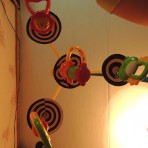 Вращающиеся пластмассовые игрушки помогут в развитии координации движений и зрения малыша. Доработали бумажными тарелочками(на фото видно) контрастных цветов, по желанию легко убираются.