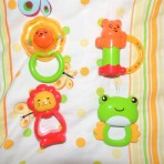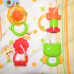 Игрушки легко снимаются и легко моются, могут использоваться как отдельные погремушки. Четыре погремушки ярких цветов имеют разное звучание, погремушка-жабка может использоваться как прорезыватель.