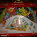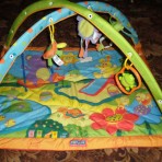 Коврик развивающийся с многими функциями,музыкальное солнышко,трещотка,погремушка,зеркальце(не настоящее),цветочек шуршащий и так далее.Укомплектован в сумку для удобного переноса.