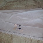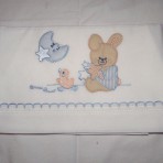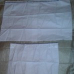 В комплект входит простынка для кроватки (рисунок по низу идет- фото4), наволочка (фото5-разные размеры в разных комплектах), простынка для коляски на резинке (фото 6). Фото 3 осталась простынка без наволочки- 40грн. Есть простыня на резинке на матрас для кроватки нежно персикового цвета, б/у- 20грн