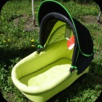 Легко и быстро крепится на коляску с помощью завязок в четырёх точках.