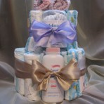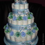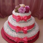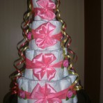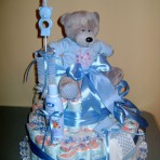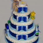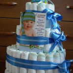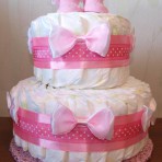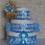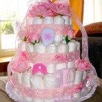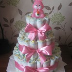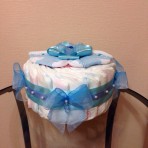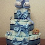 Украшать можно чем захотите начиная от атласных цветов,кружева, рюши-заканчивая игрушками, пинетками, носочками или детской одеждой,гелиевыми шариками, бутылочками для кормления, сосками,могу сделать сладкое украшение конфетами или цветы из мастики...так- же каждый памперс можно декорировать отдельно кружевом(как порционный кусочек)...В середину можно положить начинку- сюрприз (это все что перечислено выше в декоре- скрытый подарочек в общем все что душа пожелает...)