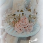 Крепится на зажиме,изготовлена из трикотажа, дополнена декором из маленьких розочек персикового цвета ,золотистыми бусинами на леске , регилином трубчатым и лентой из красивых полубусин в тон с розами.