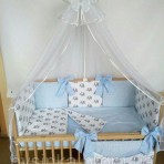 6) Охранка 360/35 (раздельная), по всему периметру кроватки, подходит и для кроватки с опускающейся стороной, так как состоит из 8-х частей, внутри ― антиаллергенный силиконизированое волокно. Охранка двусторонняя, благодаря чему Вы можете комбинировать цвет комплекта. Части защиты можно менять на Ваше усмотрение.