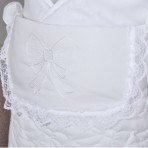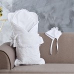 Набор для выписки – первые необходимые вещи для малыша в одном комплекте. Теплый антиаллергенный набор рассчитан на холодную погоду и включает чепчик, одеяло и конверт, украшенные белым кружевом. Одея...