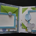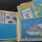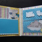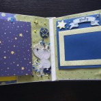 В мягкой тканевой обложке с объемным декором, завязывается на ленту. Формат альбома 20х20 см, 5 разворотов, вмещает до 70-и фотографий, также имеет конвертик и дополнительные кармашки. Чудесно подходит для первых фотографий Вашего малыша.