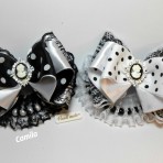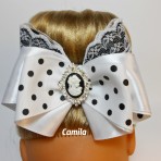 Используемые материалы – лента репсовая и атласная , кружево , бусины , нитка-резинка , фетр и камея в оправе со стразами . Размер украшения 11*9 см .