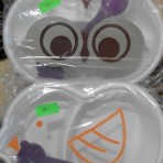 Набор посуды пластмассовой для малыша. Двухсекционная тарелка с крышкой в форме животного и ложкой в комплекте. Очень удобная.