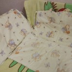 детское постельное : Защитка, подушка, одеяло ватное, пододеяльник, наволочка. В хорошем состоянии