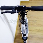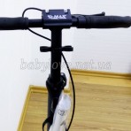 Разборной (вынимается руль), пласт.тормоз, резиновые ручки, лампа на солнечной батарее, амортизаторы (передний и задний), крыло переднего колеса, держатель для бутылки