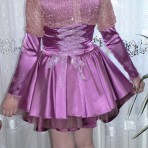 Серенево-розовый королевский атлас, смотрится дорого и нарядно. Эмитация корсета (но без косточек), сзади эмитация шнуровки лентой из органзы. Красивая апликация на левом плече сделанна вручную. Болеро из красивейшего кружева, рукава с эмитацией перчаток из такого же королевского атласа как и само платье.