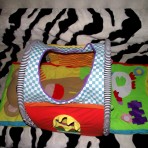 Веселый, красочный коврик-домик. Подушечка в виде мишки, на лапках шуршалки и зеркальце.Дает возможность для игры в трех вариантах: лежа на спине, лежа на животе, сидя. 3 подвесные игрушки: ключики, погремушка и музыкальная звездочка.