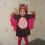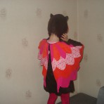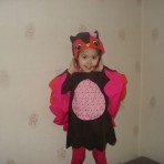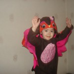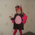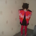 Флисовое коричневое платьице с разноцветными крыльями и шапочка в виде головы птицы.