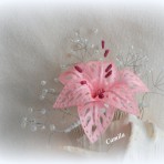 Хрустальная лилия – эксклюзивная, особенная работа! Выполнена из атласа белого и розового цвета в технике гильоширования (обжига ткани ), что позволило создать лепестки для лилии такие ажурные и нежные.