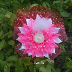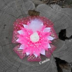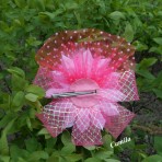 Изготовлена из органзы яркого цвета,атласа,регилина,перьев,страз,