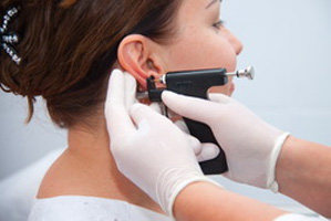 Прокол мочки уха пистолетом.