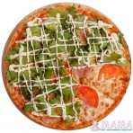 Пицца-соус, моцарелла, пармезан, филе куриное, ветчина, салат, соус цезарь, помидоры.
