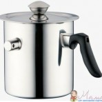 Такая посуда придумана специально для тех, у кого убегает молоко или подгорает каша. В этой емкости всё варится и разогревается на водяной бане, благодаря двойным стенкам, куда и заливается вода. Также он оснащен свистком, который сигнализирует о достижении достаточной температуры для варки. Этот интересный кухонный прибор можно также использовать для варки жидких каш. Убавьте газ и можно забыть про кашу на некоторое время. Молочник имеет нестандартную, но удобную ручку, которая не нагревается. Эта ручка позволит Вам не обжечься при использовании этой удивительно полезной посуды.