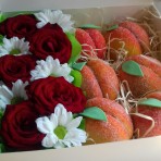 Нежное песочное тесто,очень много сгущенки и очень привлекательный вид.Какой сластена сможет устоять?Вес одного персика 140-150 грам.Возможна упаковка в подарочные коробки и корзинки,так же упаковка с живыми цветами в оазисе(позволяет цветам сохранять свою свежесть длительное время),также есть цветы сьедобные.К каждому клиенту индивидуальный подход.