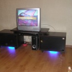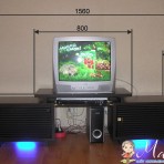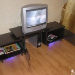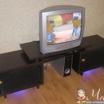 Подставка под телевизор в стиле Hi-tech. Материал: ДСП ламинированная - 25 мм толщиной (цвет - дуб венге магия или на выбор). Стекло: дверцы и полки (бронза, лакабель, пескоструй на выбор) - 4 мм, шлифовка торцев. Фурнитура: ручки, петли, стеклодержатели (цвет - сатин, хром, аллюминий, золото на выбор). Подсветка: люминисцентная (цвет - синяя, красная, зеленая, белая). Состояние - новое.
