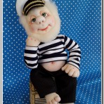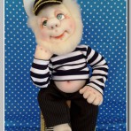 Морячок изготовлен в чулочной технике(из капроновых колгот) на проволочном каркасе. Рост 40 см.от дна сундучка и до кончика фуражки.Сундучок ширина 14см. высота 11см.