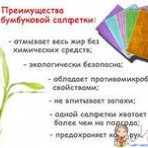 Бамбуковую салфетку можно назвать настоящей палочкой-выручалочкой. Она отлично моет жирную посуду БЕЗ моющих средств! Также ей можно протирать кафель, плиту, стол и другие предметы обихода. Её замечательное качество заключено в том, что она легко чистит поверхность от грязи и жира, а потом без проблем моется. Достаточно лишь прополоскать бамбуковую салфетку чистой водой, и она снова готова к употреблению. Важный момент – никакие моющие средства при этом не используются. Одной салфетки хватает на целый год. При этом она сохраняет свои чистящие и бактерицидные свойства, а также не впитывает запахи.