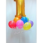 Облако из 10 разноцветных гелиевых шаров с золотой фольгированной единицей от студии аэродизайна Мир Шаров.