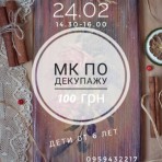 24.02 в арт пространстве ROOF состоится увлекательный мастер класс для деток от 5 лет по декупажу на кухонных досочках с чаепитием. МК проводит Татьяна Моклюк. Продолжительность 1,5 часа. Стоимость 10...