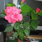 Розовая китайская роза в горшочке , небольшого размера. Первый раз цвела через 6 мес после посадки черенка , 4 цветка. Цветет часто.