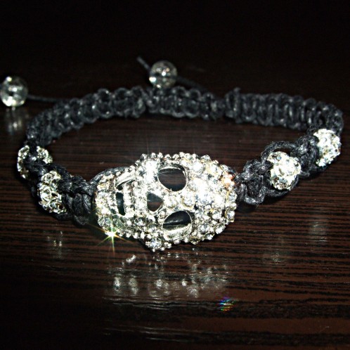 Материал — вощеный шнур, металлические бусины со стразами.