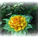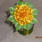 Веселая желтая розочка на зеленых листочках поднимет настроение свежестью такого цветосочетания. Роза расположена на пластиковом ободке,который украшен переплетением лент такой же расцветки.