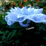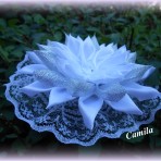 Изготовлен из атласа,парчи,кружева.В центре зеркальная каплевидная серединка.