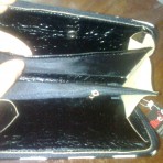ВНУТРИ: вставка-кармашек под пластиковые карты (эта "вставка-кармашек" выполнена из ткани), можно использовать для дженег или мелочи, плюс есть отделение на кнопочке - магнитике для денег или прочего, остальная внутренность - всё выполнено из натуральной лаковой кожи в тих портмоне, закрывается кошелёк на металлической молнии, на внешней стороне есть кармашек для мелочи и денег, застёгивается тоже на металлическую молнию.