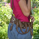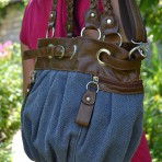 Очень удобная, вместительная. Плотная голубая ткань+ высококачественный кожзам приятного коричневого цвета, который трудно отличить от кожи. Одно большое отделение с мелкими наружными и внутренними. Длинная регулирующаяся отстегивающаяся ручка и двое коротеньких ручек-косичек.