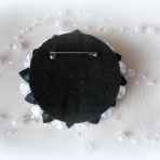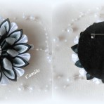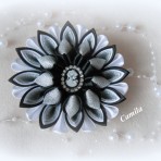 Использовалась в работе серебристая парча , атлас черного и белого цвета.В центре камея в обрамлении страз.