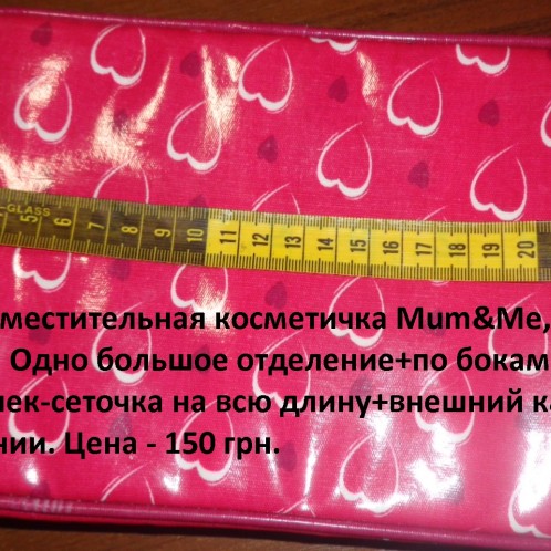 Яркая вместительная косметичка Mum&Me, р. 25*15,5 см. Одно большое отделение+по бокам кармашек-сеточка на всю длину+внешний карман на молнии. Цена - 150 грн.