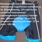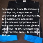 Велошорты Grane (Германия) с памперсом, в идеальном состоянии, р. 56. 82% полиамид, 12% эластан. На штанинах качественные прорезиненные манжеты, плоские швы. Длина штанины - 45 см. П/о резинки в нерастянутом виде - 37 см. Цена - 100 грн.