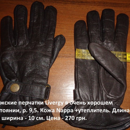 Мужские перчатки Livergy в очень хорошем состоянии, р. 9,5. Кожа Nappa +утеплитель. Длина - 24 см, ширина - 10 см. Цена - 270 грн.