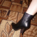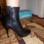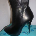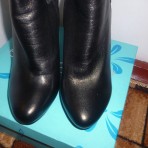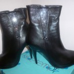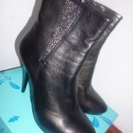 Эффектные кожаные ботинки черного цвета, на шпильке, небольшая платформа, в области щиколотки есть небольшая замшевая треугольная вставка с маленькими камушками.