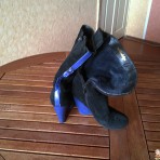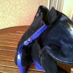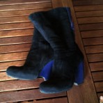 Замшевые сапоги. Состояние хорошее. Каблук сзади поцарапан. покрыт синим лаком. Лак отдаю вместе с сапогами. При носке царапины не видны. На ноге смотрятся модно. Внутри мех. Пишите, пришлю замеры.