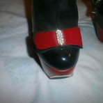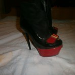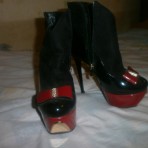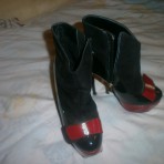 низ сапожек лаковый(как туфли),а вверх замшевый. впереди железное украшение и бантик. каблук около 13 см. состояние 5. нужно только поменять набойку. нигде не потертые, идеально подходят в ночной клуб...