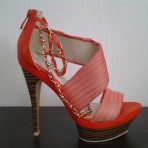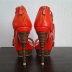 Красивые яркие босоножки Blossem. Красивого морковно-оранжевого цвета. Материал кожзам комбинированный с тканью, декорированы металлическими цепочками золотистого цвета. Высота каблука 14 см, высота ...